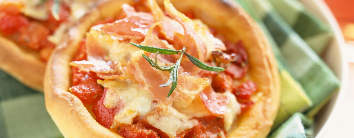 Mit diesem Rezept für kleine Pizzen können Sie ganz einfach eine schnelle und gesunde Mahlzeit zaubern: ein Pizzaboden mit Tomatensoße und Schinken. Sie erhalten im Handumdrehen einen leckeren Snack!