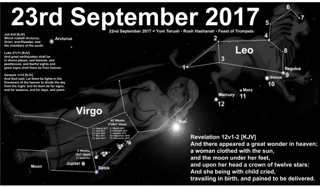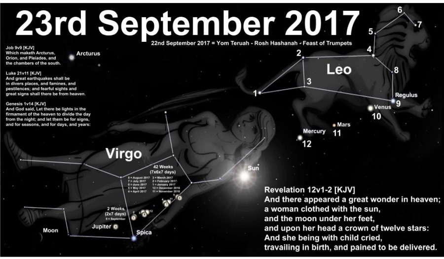 Im Grunde genommen erreicht uns am 23. September ein ganz spezielles kosmisches Ereignis, dass schätzungsweise alle 7000 Jahre eintritt. So erscheint an diesem Tag im Sternbild der Jungfrau eine einzigartige Planetenkonstellation, die wiederum vor tausenden von Jahren schon vorhergesagt wurde. Dabei steht die Sonne im Kopfbereich der Jungfrau, während die Sichel des nun zunehmenden Mondes (Der Mond befindet sich ab morgen wieder in seiner zunehmenden Phase) zu ihren Füßen liegt. Parallel dazu stehen Merkur, Mars und Venus im Sternbild des Löwen und bilden zusammen mit den Sternen des Sternzeichens 12 Sterne über dem Haupt der Jungfrau. Das Sternbild der Jungfrau wird von der Sonne erleuchtet, genau so leuchtet dieses Mal auch der Jupiter direkt im Sternbild der Jungfrau und zwar in einem Bereich, den man durchaus als Gebärmutter betrachten könnte. Dieses Ereignis findet dabei über Jerusalem statt und wurde wie halt schon erwähnt vorhergesagt.
